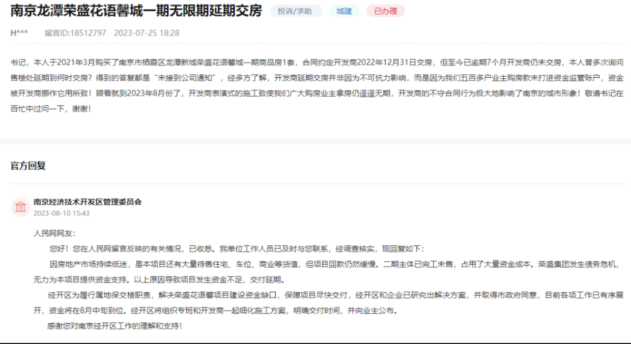 已延期交付8个月的龙潭荣盛花语馨城终于等来好消息。近日,官方回复表示,项目资金将在8月中旬到位,同时将细化施工方案,向业主明确交付时间。