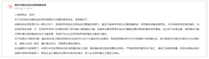 南京市雨花台区住房和建设局在一则回复中表示,项目受到消防整改难度大,整改方案需要多次协调沟通等因素影响。
