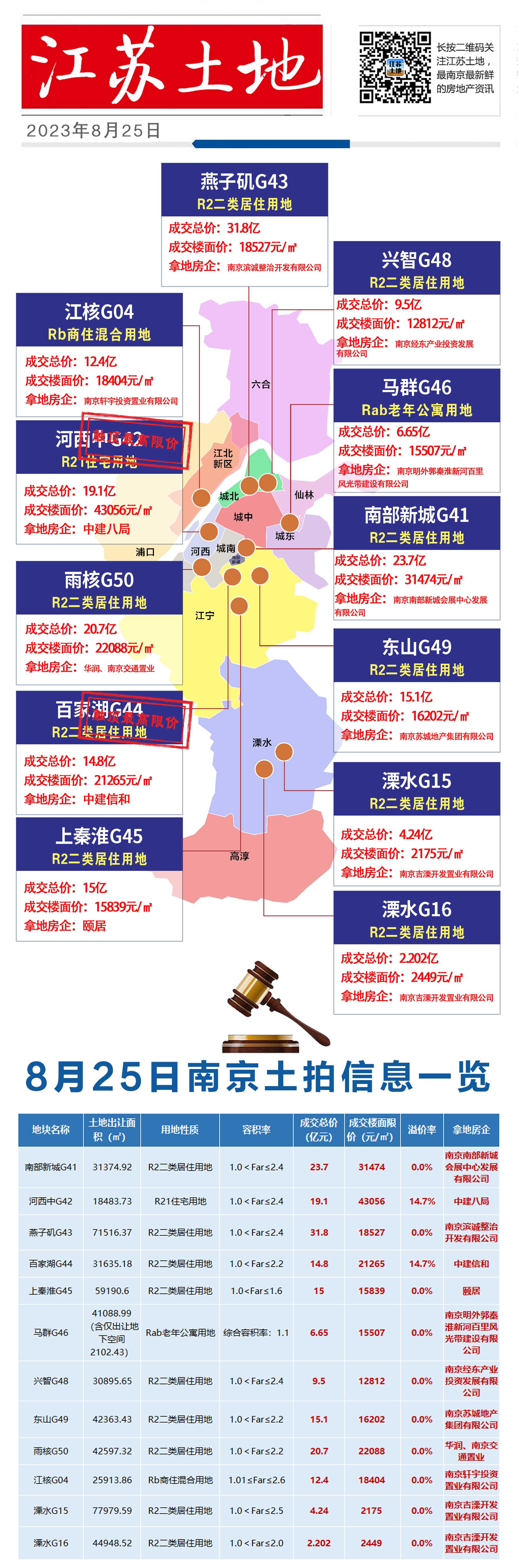 3、10幅地底价成交!其中,南部新城会展中心底价拿下南部新城G41地块,华润、交投置业底价拿下雨核G50,颐居底价竞得上秦淮G45地块,江宁城建竞得东山G49地块,南京新居建设底价竞得江核G04地块。