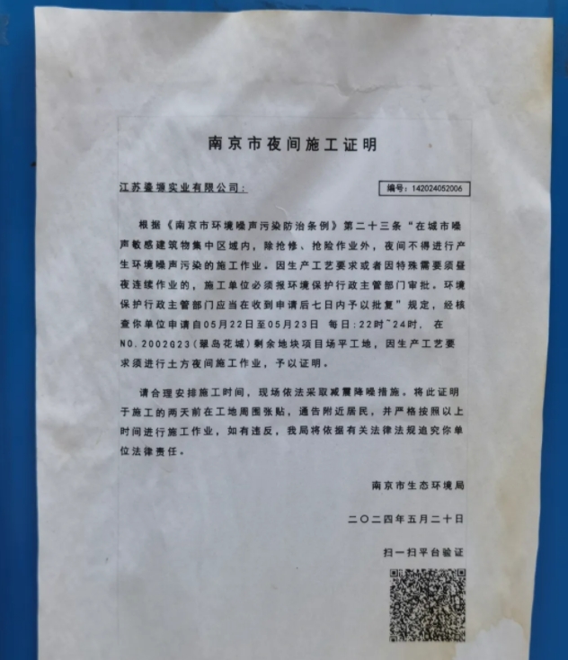 文件原文:根据《南京市环境噪声污染防治条例》第二十三条“在城市噪声敏感建筑物集中区域内,除抢修、抢险作业外,夜间不得进行产生环境噪声污染的施工作业。因生产工艺要求或者因特殊需要须昼夜连续作业的,施工单位必须报环境保护行政主管部门审批。环境保护行政主管部门应当在收到申请后七日内予以批复”规定,经核查你单位申请自05月22日至05月23日每日:22时~24时,在N0.2002G23(翠岛花城)剩余地块项目场平工地,因生产工艺要求须进行土方夜间施工作业,予以证明。