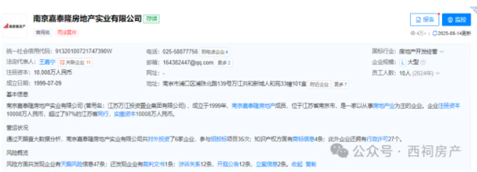 该项目开发企业为南京嘉泰隆房地产实业有限公司,此前,曾在江北开发了万江共和新城住宅项目。天眼查显示,南京嘉泰隆房地产实业有限公司 (曾用名:江苏万江投资置业集团有限公司) ,成立于1999年,是一家以从事房地产业为主的企业,实缴资本10008万人民币。