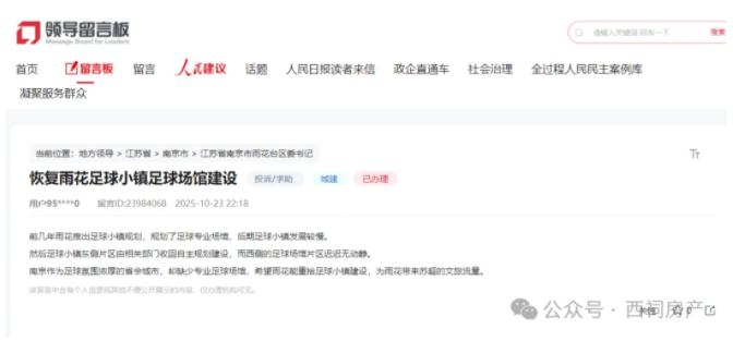 近期,“苏超”赛事的热度让南京雨花足球小镇项目重回公众视野。有网友借此契机,在人民网领导留言板上提议:希望重启该项目的足球场馆建设,使其能承接“苏超”带来的文旅流量,为区域发展注入新活力。