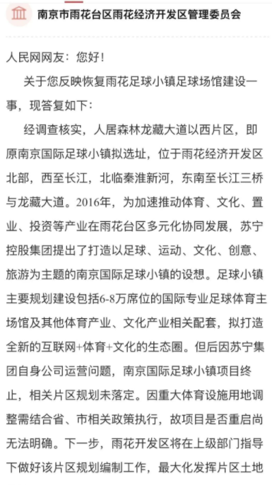 但后因苏宁集团自身公司运营问题,南京国际足球小镇项目终止,相关片区规划未落定。因重大体育设施用地调整需结合省、市相关政策执行,故项目是否重启尚无法明确。