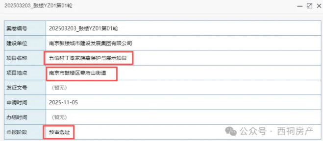 近日,据南京市规划和自然资源局官网显示,五佰村丁奉家族墓保护与展示项目正在申请预审选址,申请时间为2025年11月5日,项目建设单位为南京鼓楼城市建设发展集团有限公司。