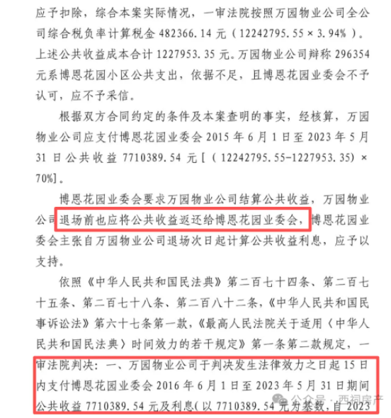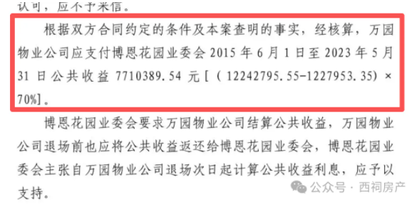 2025年11月7日,南京市江宁区博恩花园业主委员会获得一份民事判决书,要求江苏万园物业服务集团有限公司支付小区物业服务期间的公共收益约771万元及利息。