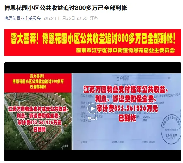 11月25日,江宁超级大盘博恩花园业委会发文,小区对公账户已收到江苏万园物业向全体业主返还的855.561236万元。其中公共收益(2016年1月1日-2023年5月31日)771.038954万元,公共收益利息(2023年6月1日-2025年11月24日)63.644982万元,判决应由江苏万园物业承担的诉讼费和保全费7.0773万元(此前由业委会垫付),判决应由江苏万园物业支付的审计费13.8万元(此前由业委会垫付)。