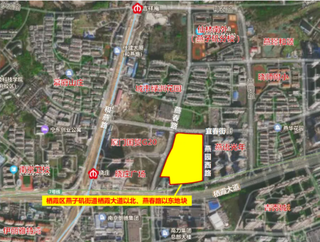 NO.2023G43项目位于栖霞区燕子矶街道,南临栖霞大道,西至燕春路,北至宜春街,东至燕园西路。