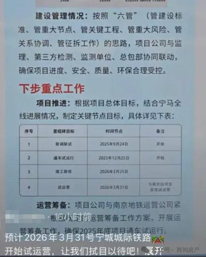 根据此前网曝的S2号线宁马城际施工现场图显示,通车试运行时间为2025年12月25日,竣工验收为2026年3月25日,试运营时间为2026年3月31日。