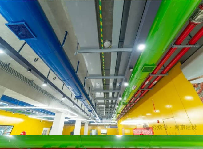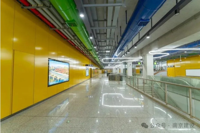 金陵石化站以南京首座工业风主题车站。这里没有传统地铁的封闭吊顶,蓝绿色圆形风管与红色消防管道在灰色清水混凝土顶面上整齐排布,与明黄色墙面形成强烈色彩碰撞,工业质感与科技感扑面而来。