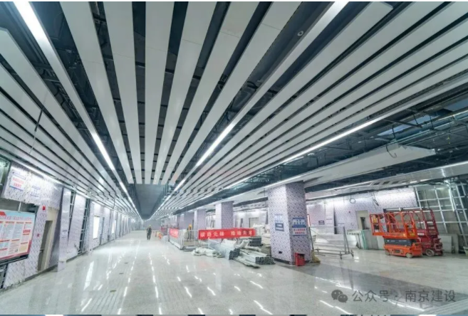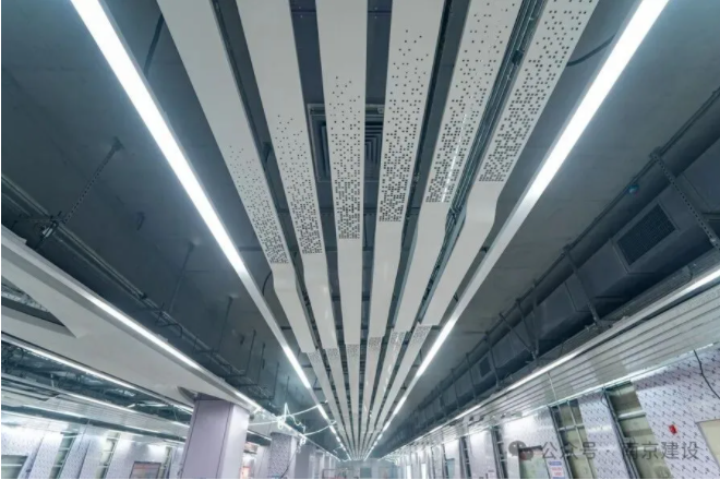 富贵山站淡紫色墙面和立柱搭配半镂空的白色吊顶,营造出温馨雅致的氛围。作为线路的标准站,富贵山站在空间布局上,以曲折造型、蜿蜒线条隐喻江河奔流,将“山水”意象巧妙融入其中,兼具实用性与设计感。
