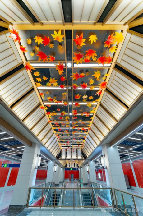 站厅顶部打造的装饰性吊顶,金色框架勾勒出仿传统建筑的坡屋顶造型,线条流畅且富有韵律,与两侧悬挂的仿古壁灯相呼应,营造出古朴典雅的氛围。屋顶下的枫叶艺术装置,用数千片形态逼真的“枫叶”舒展悬垂。在灯光映照下,宛如深秋时节栖霞山漫山遍野的枫林被“搬”进了地下空间,让市民游客未出车站,便先“触摸”到栖霞山的秋意。