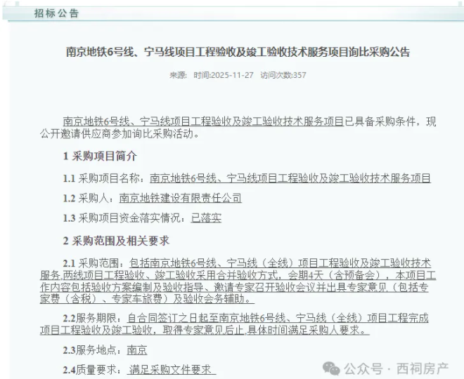公告还提到:南京地铁6号线、宁马线(全线)项目工程验收及竣工验收技术服务,两线项目工程验收、竣工验收采用合并验收方式,会期4天(含预备会)。