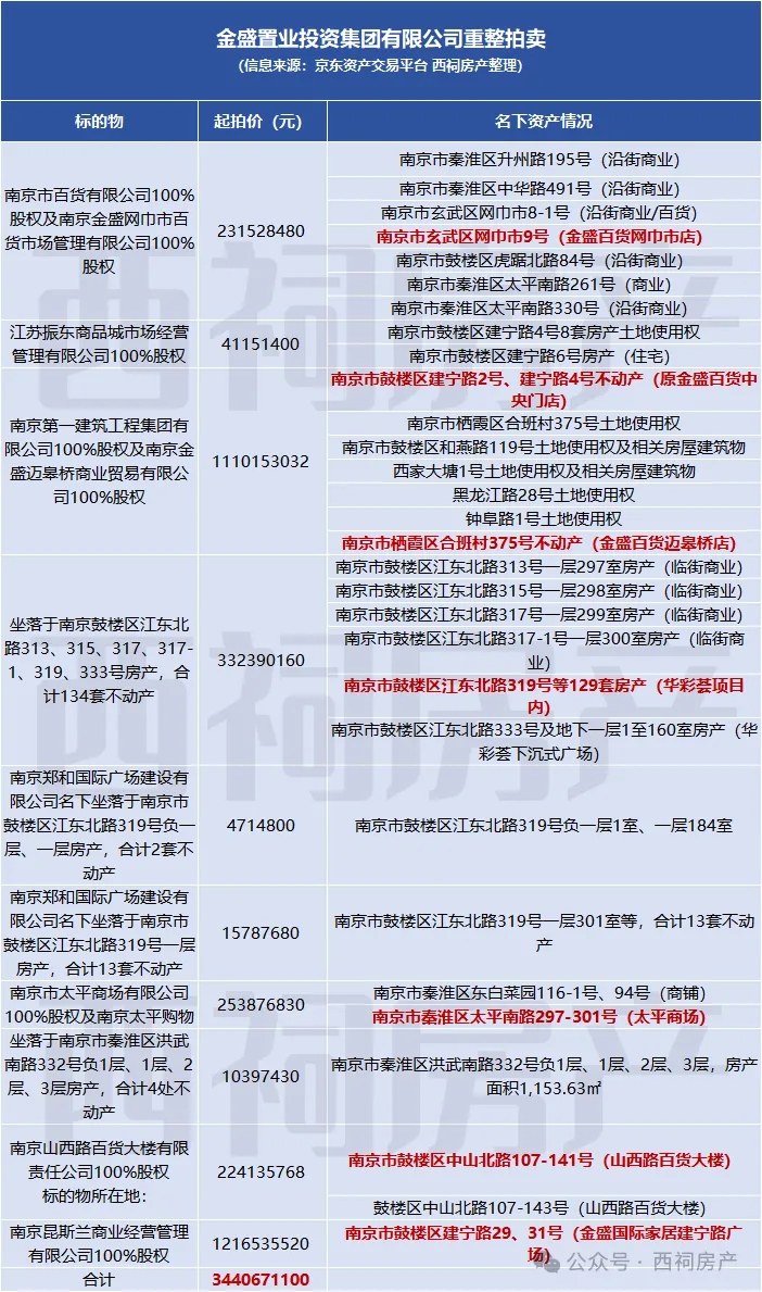 近日,据京东资产交易平台显示,金盛置业投资集团有限公司(以下简称“金盛集团”)名下多处资产遭法拍,涉及金盛百货、金盛国际家居、华彩荟、太平商场、山西路百货大楼等南京多个老牌商场。据西祠房产粗略估算,这些资产起拍价高达34.41亿元,将于12月9-11日在京东资产平台开始拍卖。
