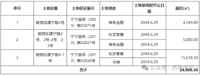 据介绍,该不动产位于南京市鼓楼区建宁路2号、建宁路4号,系三处土地使用权资产,土地使用权面积合计24,668.30㎡,土地权利性质出让,土地用途商务金融、批发零售、仓储用地,土地使用权年限40年、50年。该三处土地原建有面积16,939.78㎡有证房产及面积33,621.70㎡的未取得产证的房产,但上述房产因“10.29”火灾事故现已全部拆除,目前为净地,尚存地下室构筑物,场地内“七通一平”,合计84117.37万元。
