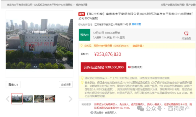 本次拍卖起拍价为253876830元,竞拍需缴纳保证金30,000,000元,最低增价幅度为50000元/次。此次拍卖,比去年起拍价2.9亿元,降了约4000万。>>>一声叹息!南京市中心80年老商场,2.9亿元抛售…