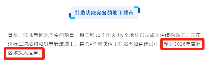 江北地下城:首批区域预计2026年投入运营。江北地下城共计7层,规划商业、停车场、公共空间等及地铁4号/11号(在建)、13号/15号(规划)区间段落和换乘站点,未来横江大道快速路从项目中穿过,建成后将进一步加强江北与江南轨道交通联系。