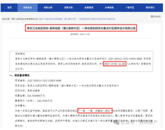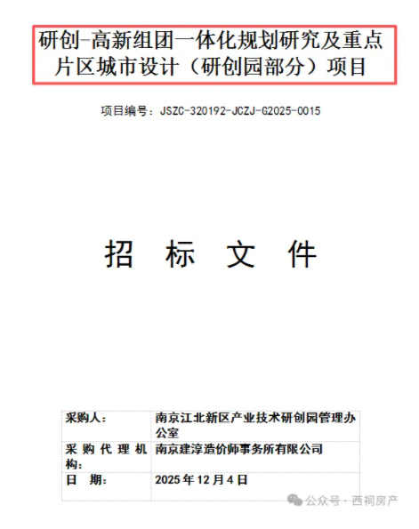 12月4日,研创园部分的采购文件发布,该项目为落实《南京江北新区·浦口区·六合区空间规划一体化实施行动方案》,作为江北新区和浦口区融合先导示范区的研创-高新组团,需共谋空间规划布局与产业发展空间、统筹资源要素。同时需结合园区发展需求,对各重点发展片区进行城市设计研究,以实现滨江价值转化,释放青奥体育公园消费引动效能,发挥南农南航学研创新转化功能。