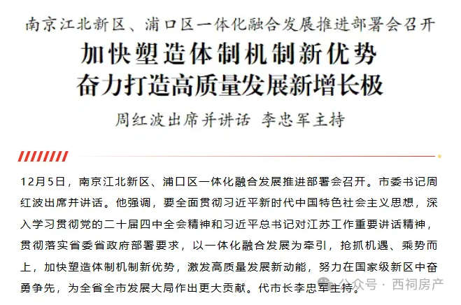 全网关注的重点来了。会上明确:南京江北新区党工委、管委会与浦口区委、区政府实行统一领导、一套班子、一体化运行,围绕国务院赋予南京江北新区“三区一平台”功能定位和推进全域高质量发展要求,充分发挥国家级新区、自由贸易试验区“双区叠加”优势,全面推进江北新区与浦口区一体化融合发展,进一步拓展江北新区发展空间、提升浦口区发展能级,为推动区域高质量发展提供坚强有力的体制机制保障。
