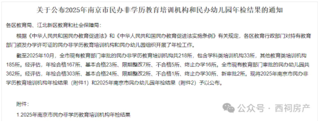 近日,南京市教育局发布《关于公布2025年南京市民办非学历教育培训机构和民办幼儿园年检结果的通知》。文件显示:全市现有教育部门审批的民办幼儿园共362所。经评估,年检合格303所、基本合格24所、限期整改2所、不合格1所、终止办学30所、新审批2所。