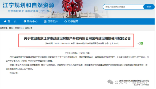 12月8日,“关于收回南京江宁市政建设房地产开发有限公司国有建设用地使用权的公告”发布,公告显示,将收回南京江宁市政建设房地产开发有限公司上述国有建设用地使用权,该地块于2003年由南京江宁市政建设房地产开发有限公司取得,位于江宁开发区庄排路以东、菲尼克斯路以北,土地登记面积为59883.92平方米。