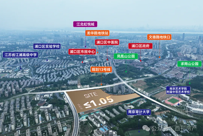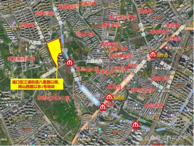 地块位于浦口区求雨山片区,雨山西路北侧、南京审计大学(浦口校区)东侧,紧邻江浦老城,坐拥凤凰大街城南河城市景观轴及凤凰山、求雨山生态资源,毗邻老山国家森林,自然资源禀赋优越。