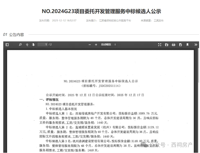 12月12日,浦口超低密项目(容积率1.05)——浦口高新G23项目委托开发管理服务中标候选人公示。据显示,N0.2024G23项目委托开发管理服务为中标候选人第1名为西南绿城房地产开发有限公司(以下简称“西南绿城”),投标报价金额为3089.76万元,服务期为整体管理服务期限48个月,总体开发建设周期为36月,且响应招标文件的服务期要求,工期/交货期/服务期:1440 天。这意味着,浦口高新G23项目将由西南绿城开发管理。