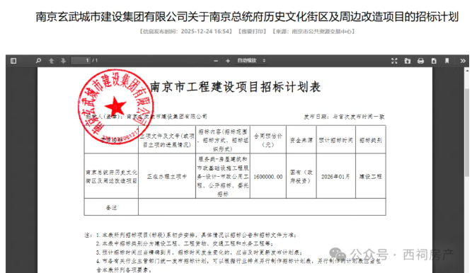 近日,据“南京市公告资源交易平台”消息,玄武城市建设集团近日发布招标计划,南京总统府历史文化街区及周边改造项目即将启动。该项目目前正在立项阶段,资金来源为国有投资,合同预估价为160万元,预计将于2026年1月正式招标。