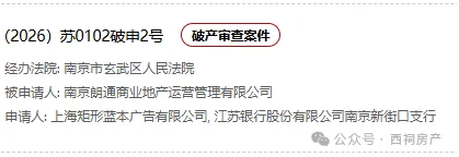 近日,“全国企业破产重整案件信息网”显示,南京朗通商业地产运营管理有限公司(以下简称“南京朗通”)被申请破产审查,申请人为上海矩形蓝本广告有限公司、江苏银行股份有限公司南京新街口支行,经办法院为南京市玄武区人民法院,立案文号为(2026)苏0102破申2号。