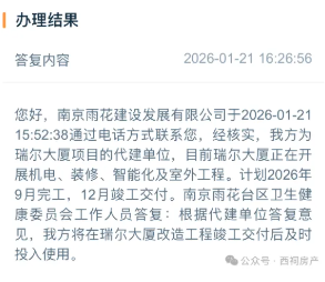西祠房产第一时间向官方咨询。1月21日,南京雨花建设发展有限公司表示:“我方为瑞尔大厦项目的代建单位,目前瑞尔大厦正在开展机电、装修、智能化及室外工程。计划2026年9月完工,12月竣工交付。南京雨花台区卫生健康委员会工作人员答复:根据代建单位答复意见,我方将在瑞尔大厦改造工程竣工交付后及时投入使用。”