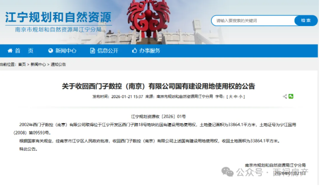 1月21日,南京市规划和自然资源局江宁分局官网发布“关于收回西门子数控(南京)有限公司国有建设用地使用权的公告”,公告显示,收回西门子数控(南京)有限公司位于江宁开发区西门子路18号地块的国有建设用地使用权,收回土地面积为33864.1平方米。