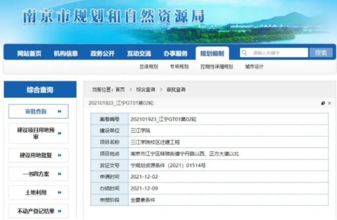 2021年12月,南京市规划与自然资源局发布三江学院迁建的最新动态,工程已经完成全部要素条件的审批。