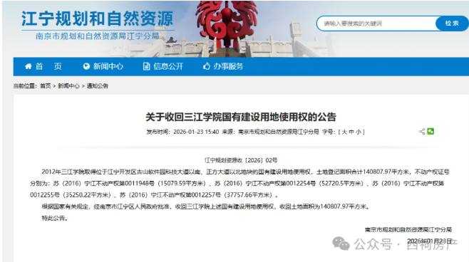 1月23日,据南京市规划和自然资源局江宁分局官网显示,“关于收回三江学院国有建设用地使用权的公告”发布,公告原文如下↓