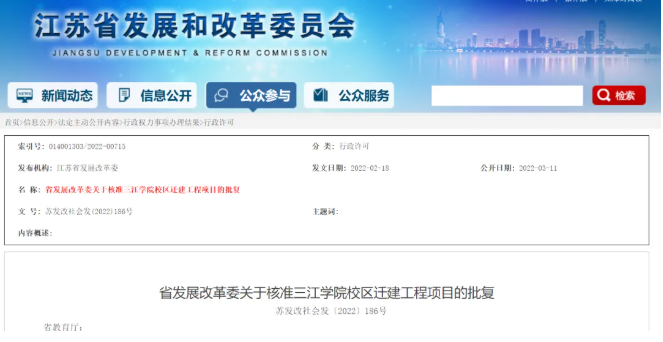 2022年2月,江苏发改委官网上发布“省发展改革委关于核准三江学院校区迁建工程项目的批复”,为改善三江学院基本办学条件,消除现有校区安全隐患,满足城市建设发展需求,同意建设三江学院校区迁建工程项目。