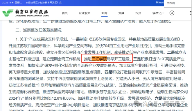 2025年5月,南京江宁开发区公示了“江苏软件园党组织关于区委巡察集中整改进展情况的通报”,通报提到:成立吉山基地工作推进组,建立定期会商工作机制,推进三江学院尽早开工建设。