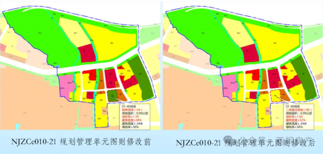 将21-40地块用地性质由特殊用地(H4)调整为二类居住用地(R2),容积率由≤1.7调整为≤1.5,建筑密度由≤28%调整至≤32%;