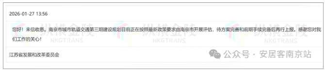 此外,知名交通领域博主“纵横金陵”披露了江苏省发改委的最新回复:南京市城市轨道交通第三期建设规划,目前正由南京市根据最新政策要求开展评估,待方案完善及相关前期手续完备后,再行上报。