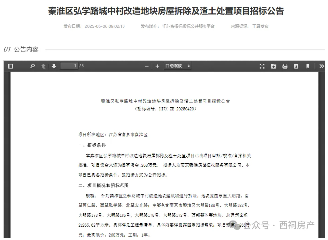 去年5月,弘学路城中村改造地块房屋拆除及渣土处置项目招标公告发布,据显示,该项目工期为1年,针对秦淮区弘学路城中村改造地块建筑物进行拆除,主要包含南京市秦淮区大明路188号,大明路182号,大明路178号,大明路186号,大明路178号,大明路172号,万邦整体等地块,总建筑面积21265.62平方米。