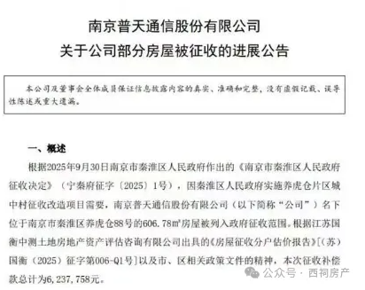 1月4日,上市公司南京普天通信股份公司发表“关于公司部分房屋被征收的进展公告”,意味着养虎仓区域拆迁取得重大突破。