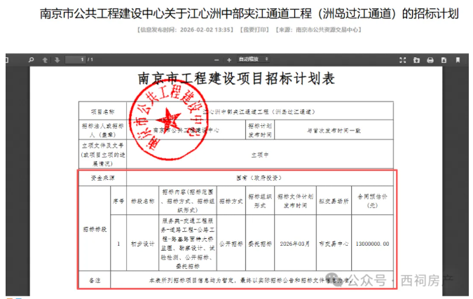 2月2日,南京市公共工程建设中心关于江心洲中部夹江通道工程(洲岛过江通道)的招标计划发布,据显示,本次招标标段为初步设计,将采取公开招标的形式,招标文件发布时间为2026年3月,合同预估价为13000000元!