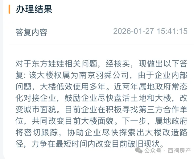 1月27日,南京市雨花台区回复:“对于东方娃娃相关问题,经核实,现做出以下答复:该大楼权属为南京羽舜公司,由于企业内部问题,大楼低效使用多年。近两年属地政府常态化对接企业,鼓励企业尽快盘活土地和大楼,改变城市面貌。目前企业在积极寻找第三方合作单位,共同改变目前大楼面貌。下一步,属地政府将密切跟踪,协助企业尽快探索出大楼改造路径,力争在最短时间内改变目前破旧现状。”