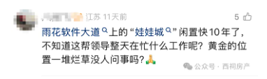 近日,有网友给西祠房产留言:“雨花软件大道上的‘娃娃城’闲置快10年了,何时能看到其复活?”