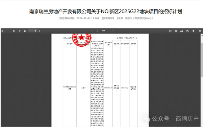 2月4日,南京瑞兰房地产开发有限公司关于NO.新区2025G22地块项目的招标计划发布。计划显示,NO.新区2025G22地块项目正在立项中,招标内容为施工总承包,合同预估价为7.33亿元,预计招标时间为2026年04月。