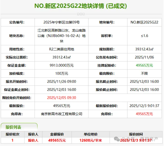 NO.新区2025G22地块位于江北高新,去年11月,被南京新高市政工程有限公司以4.9565亿元底价拿下,成交楼面价为7880元/㎡。