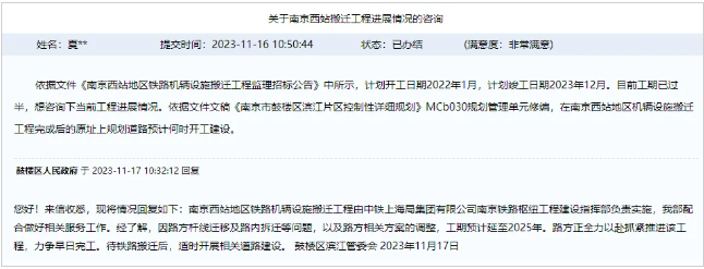 2023年11月,鼓楼区人民政府表示,南京西站地区铁路机辆设施搬迁工程由中铁上海局集团有限公司南京铁路枢纽工程建设指挥部负责实施,我部配合做好相关服务工作。经了解,因路方杆线迁移及路内拆迁等问题,以及路方相关方案的调整,工期预计延至2025年。路方正全力以赴抓紧推进该工程,力争早日完工。待铁路搬迁后,适时开展相关道路建设。