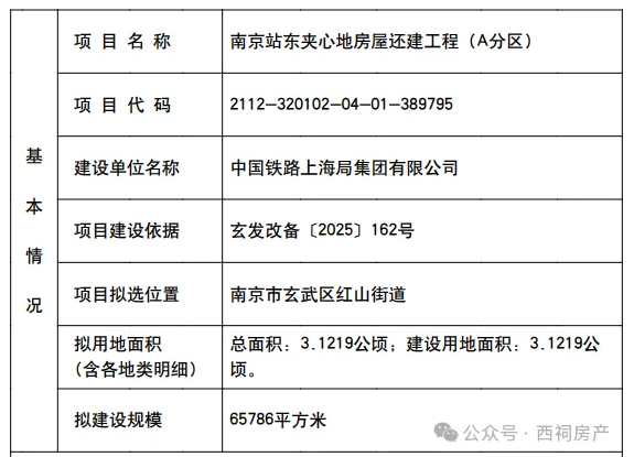 2024年11月,南京站东夹心地铁路房屋还建工程规划设计方案曝光。规划显示,拟新建总建筑面积约65786平方米,其中:地上建筑面积约52148平方米,主要建设铁路部门相关办公用房、数据中心等;地下建筑面积约 13638平方米,主要建设设备机房及地下车库等。