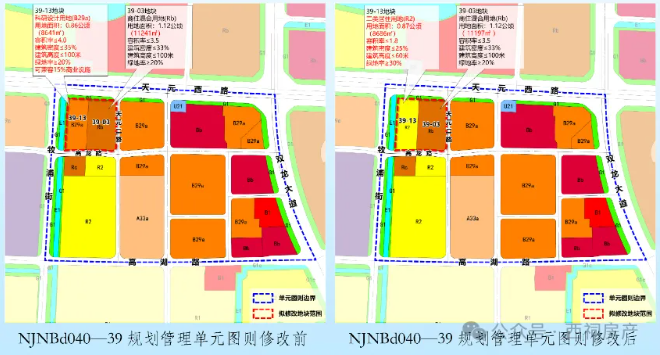 将39-13地块用地性质由科研设计用地(B29a)调整为二类居住用地(R2),指标调整为:用地面积为0.87公顷,容积率≤1.8,建筑高度≤60米,建筑密度≤25%,绿地率≥30%;