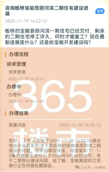 去年11月,有媒体报道称,项目售楼处已人去楼空。当时,雨花住建部门表示,对于该项目二期的建设问题,宝能集团和江苏银行正在对接处置路径。