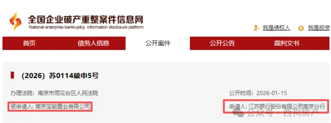 据全国企业破产重整案件信息网消息,近日,南京宝能置业有限公司被申请破产审查,申请人为江苏银行股份有限公司南京分行,办理法院为南京市雨花台区人民法院。