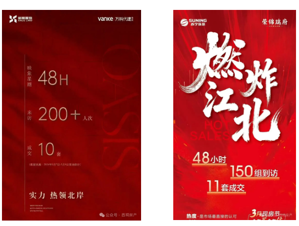 江北核心区万科映象星潮周末两天来访超200+,成交10套;桥北荣锦瑞府48小时内150组到访,11套成交。