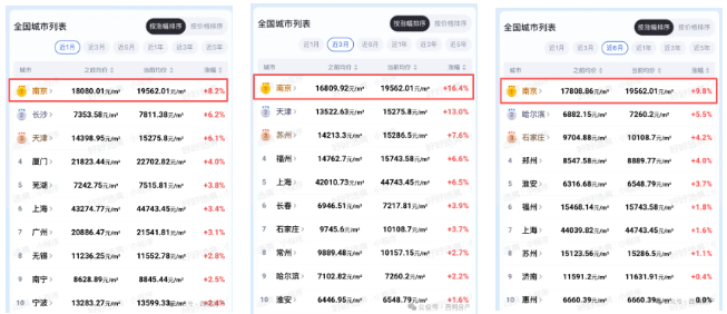 据好好选房数据显示,南京二手房成交均价近1个月涨幅8.2%,近3个月涨幅16.4%,近6个月涨幅9.8%,均为全国第一。
